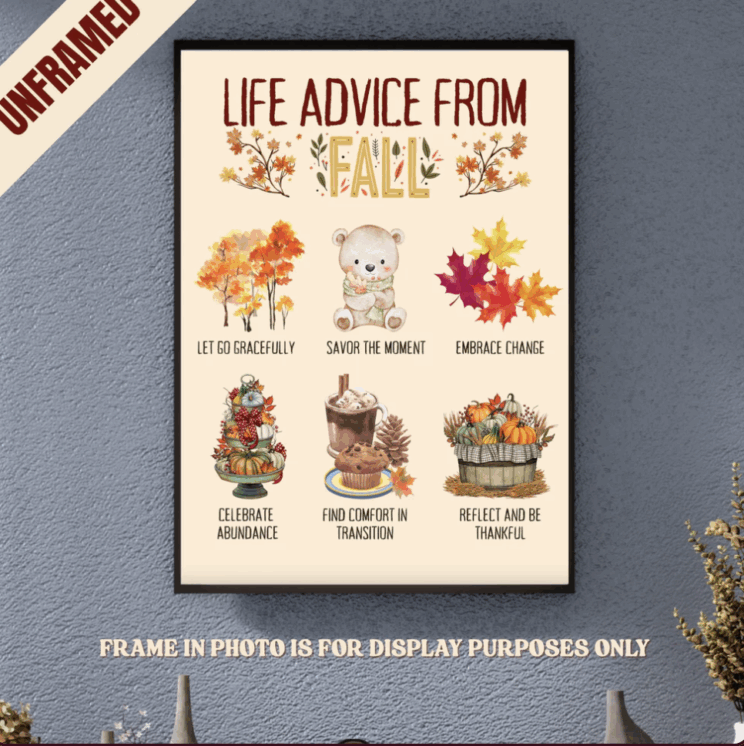 Bring warmth, gratitude, and inspiration to your space with this cozy fall poster featuring thoughtful life advice and charming autumn artwork. Perfect for anyone wanting to savor the beauty of fall, celebrate gratitude, or refresh their home or office decor during autumn, Thanksgiving, or cozy season changes. Designed for those who love reflecting on life’s blessings, this printable poster makes a heartfelt gift and a seasonal touch to family gatherings, classrooms, or peaceful workspaces.