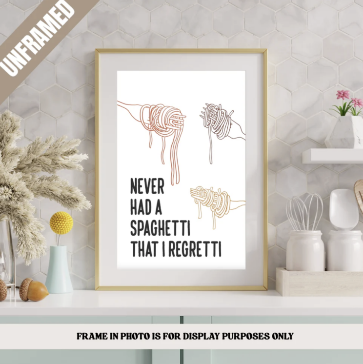 Celebrate your love of carbs and Italian comfort food with this “Never Had a Spaghetti that I Regretti” poster, featuring twirling forks of pasta and a fun, bold design. Perfect for Nonna’s kitchen, pasta lovers, home chefs, and anyone who wants a cheerful Italian touch in their dining room, café, or home bar. This print makes a great birthday, housewarming, or holiday gift for foodies who believe there’s no such thing as too much spaghetti.